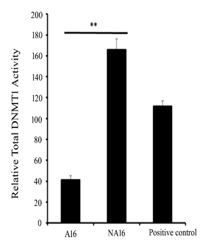 Figure 1 The Standard deviation bar graph represents DNMT Activity in Control (A16) and Transformed Cells (NA16). The standard deviation is calculated from the average of three individual experiments.