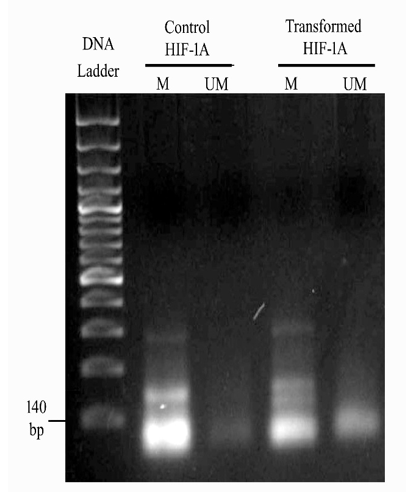 Figure 2 2% agarose gel of MSP PCR product of HIF1A in control and transformed cells. The above figure illustrates Lane 1 150 bp DNA ladder, Lane 2, intensified Methylated HIF1A in control cells, Lane 3, Faintest unmethylated HIF1A in control cells, Lane 4, intense thick methylated HIF1A in transformed cells, Lane 5, slightly visible unmethylated HIF1A in transformed cells.