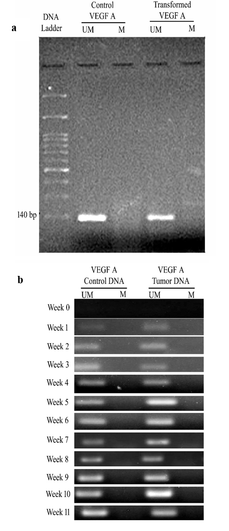 Similarly, the MSP for VEGFA, as shown in Figures 3a and 3b, clearly revealed the presence of unmethylated VEGFA in both cell conditions (Control and transformed). The band intensity showed no difference for unmethylated amplicons of product size 140 bp (Table SII). When injected into the nude mice, unmethylated VEGFA appeared in the blood circulation from weeks 1 to 11. The results from the band intensities showed elevated levels up to 1.3547 in the tumorigenic animal when compared to the control animal (Table SIII).