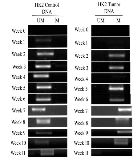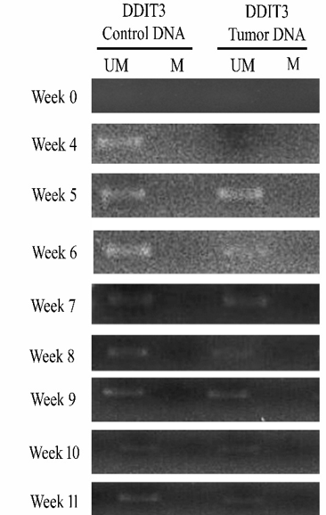 Figure 5 2% agarose gel of MSP PCR product of DDIT3 in control and tumorigenic animals. Week-wise analysis of the release of unmethylated DDIT3 in control and tumorigenic nude mice