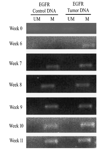 .It was observed that methylated EGFR was released into the circulation from 6th to 11th week in both control and tumorigenic animals (Figure 6). The band intensity results showed maximum intensity 1.0 at week 10 in both control and tumorigenic animals (Table SVI). However, the amplification level in the circulation for the gene was progressive in control and tumorigenic animals.