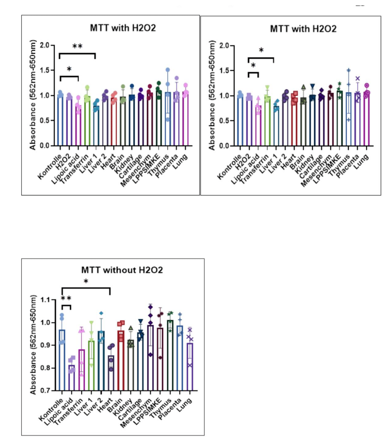 The data demonstrate that organ-specific extracts can improve cell survival during oxidative stress induced by H₂O₂. In the absence of H₂O₂, some extracts also enhance cell viability, though this effect is less significant than under oxidative conditions (see Figure 1). The results from the MTT assay, conducted both with and without H₂O₂, are illustrated in three panels (top left, top right, and bottom), measuring the metabolic activity of cells treated with various extracts, which correlates with cell viability through absorbance readings at 562 nm - 650 nm.