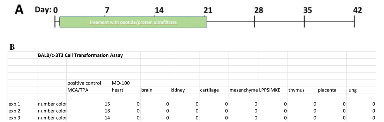 Results: According to MTT assays, the 300 kDA peptide/protein cellular extracts “MitoOrganelles” (MOs) tested did not affect the viability of MCF-7 cells. In addition, cells that were stressed with low doses of H2O2 were able to improve their vitality through the addition of MOs 300 kDa. The BALB/c-3T3 two-stage in vitro transformation assay (CTAs), a model for studying carcinogenesis, is another important tool in our research. It showed chemical transformation with morphologically aberrant foci after treatment with MCA and TPA. In contrast, various 300 kDA peptide/protein cellular extracts were tested, and no carcinogenic activity was observed, reinforcing the safety profile of these cellular extracts. The confidence in our research methods, particularly the MTT and BALB/c-3T3 assays, is crucial in understanding the safety profile of these cellular extracts.