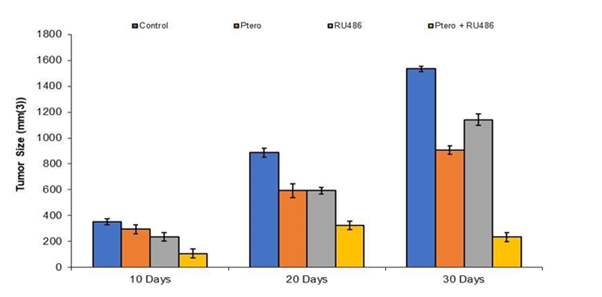 In order to assess whether FloraStilbene possesses ability to suppress tumor growth, the classical triple negative 4T1 model was utilized. 4T1 cells were grown in RPMI 1640 media in a fully humidified atmosphere with 5% carbon dioxide. 4T1 triple-negative murine breast cancer cells were administered to female BALB/c mice at a concentration of 500,000 cells per mouse in the mammary pad. Mice were treated with either a) saline; b) pterostilbene at 2 mg/kg; c) RU-486 at 3 mg/kg; or d) a combination of pterostilbene and RU-486. Each treatment group consisted of 10 mice. As shown in Figure 1 below, significant synergy was observed in the regression of this model of breast cancer.
