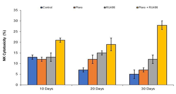 Additionally, augmentation of tumor sensitivity to NK cell-mediated killing by pterostilbene has been reported. Yulin et al reported that pterostilbene treatment enhanced the expression of NK group 2 member D (NKG2D) ligands- major histocompatibility complex class I chain-related proteins A and B (MICA/B) on prostate cancer cells. These molecules are typically seen as activators of NK natural cytotoxicity towards cancer cells. The authors found that inhibition of miR-20a by pterostilbene was occurring, which normally silences expression of the 3' untranslated region (UTR) of MICA/B. Blocking expression of miR-20a by pterostilbene results in up regulation of MICA/B, making prostate cancer cells significantly more sensitive to NK-mediated killing.146 Given that RU-486 enhances NK activity, a potent synergy is anticipated between these two agents. Accordingly, we initiated a series of experiments to assess this hypothesis.