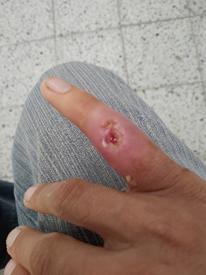 At the time of the emergency consultation, he tells the doctor on duty that 6 days ago he began the process with a slight pain in the proximal phalanx, and that after 2 days, he noticed a small lump in the area with a hard consistency. He began treatment with 500 mg of amoxicillin every 8 hours for 5 days, which did not work, since the granule continued to grow exponentially, until forming a prominent mass of great consistency that was hard to the touch, with severe pain, almost unbearable, whose pathological characteristics corresponded to infectious cellulitis.