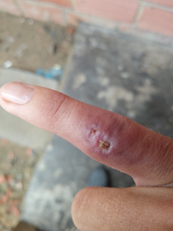 A 40-year-old Venezuelan patient, who has been living in the municipality for 7 years, is presented at the emergency room of the public hospital in Tibú-Colombia. He reports intense pain in the little finger of his right hand, due to a visible severe inflammation above the proximal phalanx. The vital signs are normal, with no significant involvement.