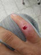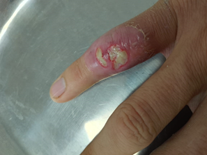 In the following photographs taken of the patient with his consent, the clinical evolution of the infection during and after hospitalization is presented. Figures 1 - 4 show a local inflammation in the little finger, with erythema and accumulation of interstitial fluid. On day 2 of hospitalization, part of the dead upper skin was removed to expose the lesion, and in this way clean the area well through daily dressings under the responsibility of the nursing staff.