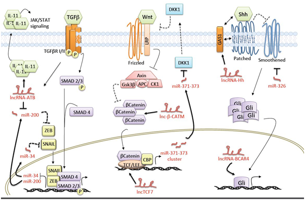 CSCs express mesenchymal traits, typical of cells that underwent epithelial-to-mesenchymal transition (EMT). The EMT program in non-pathological conditions has a pivotal role in development and tissue homeostasis. It is governed by several convergent signal transduction pathways that cooperate to integrate environmental stimuli. In the tumor context autocrine and paracrine factors secreted both by tumor cells and non-cancerous tumor-associated cells of the stroma (fibroblasts, endothelial cells, immune cells) contribute to activate and sustain the EMT program in CSCs. The main pathways controlling EMT will be described in this section that will provide an overview of stemness regulation triggered by ncRNAs.