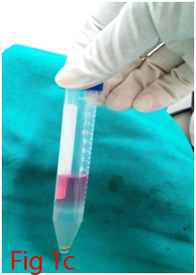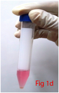 Two male Wistar rats of 14 weeks age were used for bone marrow collection. Prior permission was obtained from Institutional Animal Ethics Committee (IAEC) for conducting animal trials. Shortly after euthanizing the animal, back side extending from lumbar region to toes were shaved and aseptically prepared for dissection (Figure 1A). Skin incision was given on the lateral aspect of the thigh and both tibia and femur were exteriorized after removing the muscular and tendinous attachment (Figure 1B). Femur and tibia of both the legs were placed separately in a 50ml centrifuge tube containing DPBS (Dulbecco's Phosphate Buffered Saline) and antibiotics. It was then placed under laminar hood in petridish containing DMEM (Dulbecco's Modified Eagles Media) with antibiotics. With a scissor the metaphyseal region of both bones were cut. After inserting a needle into the medullary cavity the bone marrow was flushed out using DMEM into a 15ml centrifuge tube. Flushed out bone marrow was centrifuged for 5minutes at 1000rpm in order to concentrate the cells. The supernatant was decanted and 5ml of complete media was added to the tube and mixed well by pipetting. Cell suspension was layered over equal quantity of histopaque and again subjected for centrifugation at 2500rpm for half an hour. After this density gradient centrifugation mononuclear cells were collected from the interface and washed with Ca++ and Mg++ free DPBS (Figure 1C). Obtained cell pellet was again washed and resuspended in complete DMEM (Figure 1D). Cell counting was done after addition of trypan blue dye in an automatic cell counter and was then seeded in T flask with a cell concentration of 1×106cells/ml. After 72hours of seeding, non-adherent cells were removed by decanting the media. Every 3 or 4days media was replaced until the flask attained confluency.