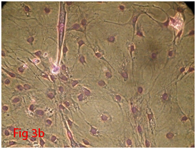 Colony forming unit-fibroblast (CFU-F) assay was used to assess the proliferation of cells and colonoigenic capacity of stem cells.8 Low density plating of cells resulted in the formation of colonies which was visible with Giemsa staining (Figure 3A,3B). Very little ECM present within the bone marrow allows mechanical disruption and dissociation of hematopoietic cells by simple pipetting and passage through syringe needles of decreasing bore. These single cell suspensions of stromal cells of bone marrow (BMSCs) when plated at low density could adhere rapidly to plastic surface. Non adherent hematopoietic cells suitable culture environment each of which is derived from a single precursor cell, the CFU-F.9 The mitogenic factors that stimulate the proliferation of CFU-F are not fully understood, but it is hypothesized that these include epidermal growth factor (EGF), insulin-like growth factor-1, transforming growth factor-β platelet-derived growth factor (PDGF) and basic fibroblast growth factor.10 Multi-colony-derived strains, where all colonies are combined by trypsinization, can undergo more than 25 passages in vitro (more than 50 cell doublings) under optimal culture conditions. This indicates the high self-replication capacity of BMSCs. Hence, millions of BMSCs can be produced from a limited quantity of aspirated bone marrow. Thus, BMSCs can be defined as cells which are adherent very rapidly with colonogenic property and able to proliferate extensively.