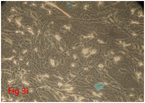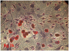 Rat mesenchymal stem cells supplemented with osteogenic induction media could differentiate into osteogenic lineage after 21days of culturing. Presence of extracellular mineralization was detectable on alizarin red staining. Positive osteogenic lineage showed intense red staining with alizarin red (Figure 3G) whereas, control culture showed light yellow background staining (Figure 3H). Adipogenic differentiation was detectable after 28days of culturing in adipogenic differentiation medium. By oil red O staining visible red colored lipid droplets was detected (Figure 3I). The control culture was negative for intracytoplasmic lipid droplets (Figure 3J). Chondrogenic differentiation of rat mesenchymal stem cells was achieved by supplementation with Stempro chondrogenic differentiation media. After 18days of culturing, differentiated chondrocytes with proteoglycans were positive for Alcian blue staining (Figure 3K) whereas, the control culture was negative (Figure 3L).