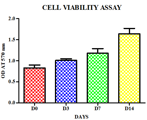 Cell viability of stem cells under standard condition was measured by MTT assay.11 MTT was reduced by the mitochondrial dehydrogenises present in the proliferating cells. Active enzymes in the live cells transform tetrazolium into intracellular formazan crystals.12 Cells were incubated with tetrazolium salts for 4hours. Formazan salts became soluble after the end of incubation and absorbance was recorded at 570nm in an ELISA reader. The absorbance will be proportional to the number of live cells in the wells that has reduced the MTT. Mitochondrial dehydrogenase was reduced by MTT and there was gradual increase in the absorbance at 570nm on day 3, 7 and 14 as compared to day 0 (Figure 4 & Table 1). There was significant increase in the OD value of D14 in comparison to D7, D3 and D0. There was significant increase in OD value of D7 when compared to D0. OD value of D3 was non-significantly higher when compared to D0.