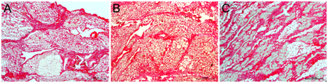 Figure 2 Picrosirius red (PSR) staining of lactating (A), mastitic (B) and cancer of goat mammary glands. Magnifications 400 X.