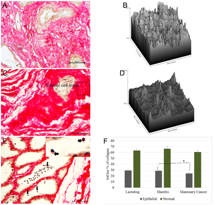 Figure 3 Quantification of PSR staining. PSR quantified in epithelial and stromal compartments of lactating, mastitic and cancer tissues. Integrated density (IntDen) of collagen fiber (expressed in terms of intensity of collagen fiber, of total image intensity) in lactating gland (A) was measured. Surface plot of collagen fiber ROI from lactating tissue (B). In cancer (C), collagen fiber was densely packed around cancer cell mass as show in surface plot of ROI (rectangle area) (D). In mastitic tissue (E) a pinch of collagen fiber (arrows and inset picture) was associated with inflammatory cells present in alveolar lumen. Semi-automatic quantification of PSR stained sections revealed difference in collagen area of mastitic and cancer tissue in stromal compartment (F)..