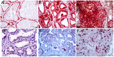 Figure 4 Immunostaining of MUC1 and Ki67 in goat mammary tissue. Expression of MUC1 in lactating tissue was present in cytoplasmic and apical boarder of alveolar cells (A). In mastitis, MUC1 expression was not remained confined to apical boarder but diffused all over the cytoplasm of alveolar cells (B). In cancer, MUC1 expression was high, aberrant (that is nuclear rather than cytoplasmic) and not limited to MEC but stromal cells as well (C). Sometimes minimal expression of MUC1 was observed and was associated with poorly differentiated MEC (not shown). .