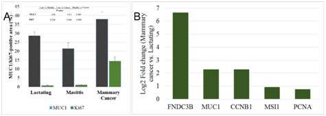 Figure 5 Expression analysis of cancer cell markers and cell proliferation markers in goat mammary glands. Immunohistochemical localization of MUC1 and Ki67 in lactating, mastitic and mammary cancers (A). Comparisons of MUC1 and Ki67 expression among three groups of animals with p-value is given. Fold change (log 2) of transcripts of cancer cell markers (FNDC3B and MUC1), cell proliferation markers (CCNB1 and PCNA) and mammary stem cell marker, musashi (MSI1) showed up-regulation in mammary cancer (B).