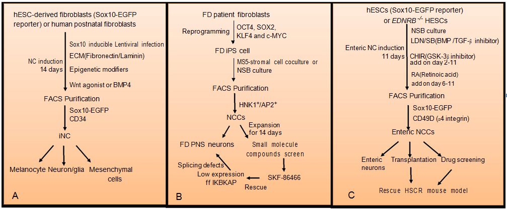 (A) Human embryonic stem cells (ESCs)- derived fibroblasts harboring SOX10-EGFP reporter or postnatal is directly reprogrammed into NCCs by lentiviral- mediated over expression of SOX10 together with a combination of extracellular matrix (ECM) components (fibronectin/lamin), epigenetic modifiers, and Wnt agonist or BMP4. Induced NC (iNC) cells expressing SOX10-EGFP or CD34 are further enriched by flow cytometry. Purified iNC can differentiate into different derivatives. (B) Familial dysautonomia (FD) patient fibroblasts are reprogrammed into induced pluripotent stem cells (iPSCs) after transduction with four Yamanaka factors (OCT4, SOX2, KLF4 and c-MYC). The FD-iPSCs are further differentiated into NCSCs by using MS5 stromal coculture or NSB culture. HNK1+/AP2+ FD- NCSCs are purified by flow cytometry and expanded for 14 days. FD-NCCs are then subject to PNS neuronal differentiation for disease mechanism study or small molecules screen for therapeutic development. (C) hESC (Sox10 -EGFP reporter) or EDNRB -/-hESC are induced to enteric NCSCs by using a dual SMAD inhibition (DSi) protocol with optimized level of BMP, TGF-β, Wnt and RA signaling. Enteric NCSCs expressing CD49D and SOX10-EGFP are enriched by flow cytometry. Purified enteric NCSCs are subject to enteric neuronal differentiation, in vivo transplantation and drug screen for HSCR therapeutic treatment.Neural crest-associated diseases and stem cell therapy