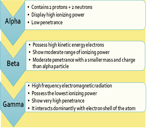 Radiation also generates autoimmune encephalomyelitis and neuro-immune diseases in experimental rats.10 Radiation also imposes pathogenesis like lesions, coagulation necrosis and obstructions in blood flow and causes infarction.11 It also affects melatonin, a vital natural neuro-hormone that regulates our circadian rhythms and acts as a powerful antioxidant, anti-depressant and immune system enhancer. The quantity of radiation reaches the brain and alters patho-physiology of central nervous system (CNS) and generates delayed effects such as demyelination, gliosis and necrosis. Radiation also absorbed through radioreceptors and induces various syndromes and neurological diseases.12 Further, high dose of radiation severely affects daily sleep/wake cycle, hormone production and immune system activity. It also affects blood pressure and interferes with daily activity cycles either directly or indirectly through heart rate cycle, metabolic rate, body temperature regulation, and the autonomic nervous system. It also causes significant changes in molecular and cellular mechanisms and causes allergic encephalomyelitis.13 Several treatments are prevalent to control cancer growth, but few have the desired success. Adjuvant therapy is also used to kill cancer cells that may remain after primary treatment to reduce the chance of the cancer returning.14 Adjuvant radiation therapy is used to treat people with pancreatic cancer. It completes stage II invasive ductal carcinoma, stage III adenocarcinoma, stage T4 carcinoma, and stage N1 adenocarcinoma stage,15 of the head of the pancreas. Common adjuvant treatments include chemotherapy, radiation therapy, and hormone therapy. Palliative care can help relieve signs and symptoms caused by the side effects of treatment or by the cancer itself. Surgery, radiation therapy, chemotherapy, and hormone therapy can be used to relieve symptoms. Other drugs can relieve symptoms such as pain and shortness of breath. Radiation therapy is a form of adjuvant therapy used in many cancer treatment protocols. Radiation therapy uses powerful beams of energy, such as X-rays or protons, to kill cancer cells. Radiation therapy can be performed by applying an external beam of radiation or placed inside the patient's body, known as brachytherapy. Radiation therapy uses alpha, beta, beta/gamma, or electron emitters. In general, alpha therapy is highly selective for cancer treatment because it has few side effects (Figure 1). The advantage of radionuclide therapy is that it delivers a high absorbed dose to the target tumor without affecting the surrounding normal tissue.16 Additionally, the selectivity of radionuclide therapy makes it useful for the treatment of systemic malignancies such as bone metastases.