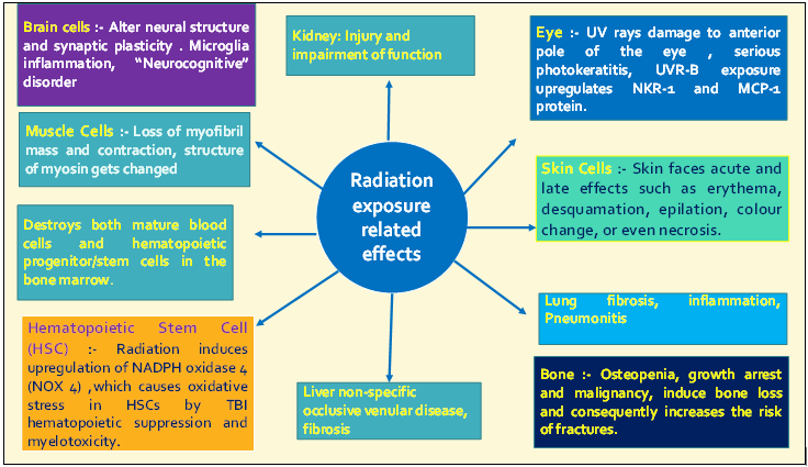 Effect of radiation on glial cells: Therapeutic ionizing radiation massively effect neural stems cells, endothelial and microglial cells. Radiation-induced brain injury (RIBI) activates microglia cellswhich results in progression of chronic neuroinflammation. Radiation also generates late effects and results in brain tumors and imposes neurocognitive disorders.102 It decreases neurogenesis and differentiation, and causes alteration in neural structure and synaptic plasticity. Cell replacement therapy is used for restoration of memory and cognition deficits.103 It increases oxidative stress, inflammation and adverse effects in the brain (Table 3). Radiation also affects myofibrils, the contractile organelles from striated muscles (Figure 2).