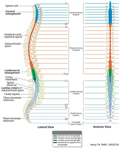 The image shows the anatomy of the spinal cord, including the various segmentations and pairing of nerves.