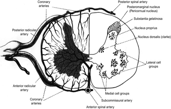 The image shows the arteries that supply the spinal cord with blood as well as the cell groups that exist within the cord.