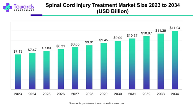 The image shows the projected increase in the global spinal cord injury market, highlighting an overall increasing trend until 2034.