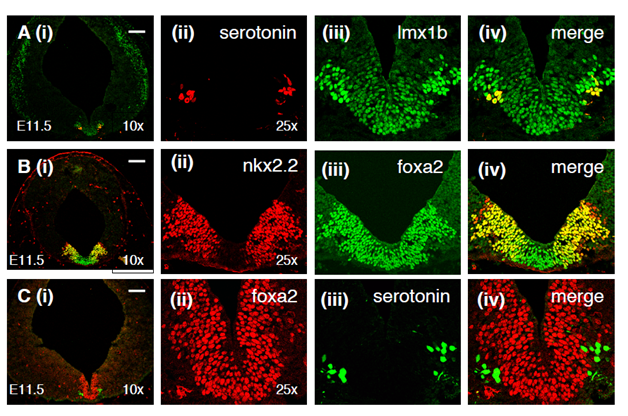 Figure 1 Expression of floor plate markers in relation to serotonin neuron development. (A) Lmx1b (green) is weakly expressed at the midline in the medial floor plate and much more strongly expressed in neurons immediately adjacent to the medial floor plate. Serotonin immunoreactivity (red) is seen in the ventralmost lmx1b-expressing neurons. (B) Nkx2.2 (red) which is expressed in serotonin progenitors is coexpressed with foxa2 in (green) in the lateral parts of the foxa2-expressing floor plate. (C) While serotonin neurons (green) appear to arise from the lateral foxa2-expressing progenitors, they do not continue to express foxa2 when they differentiate. Bars in all figures signify 100 microns.