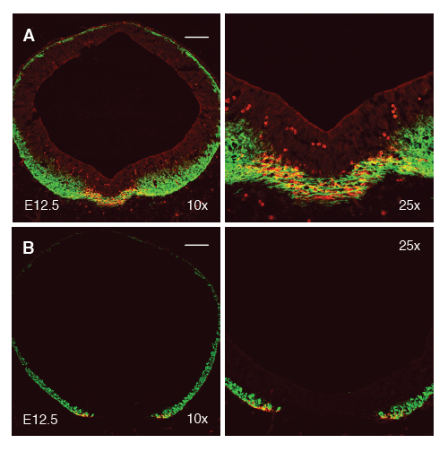 Figure 2 The floor plate is neurogenic in the midbrain but not the hindbrain. (A) Neurons, stained for beta-tubulin (Tuj1, green), are generated continuously across the ventral midline. Neurons at the ventral midline of the developing midbrain are predominantly stained for the dopamine neuron marker, tyrosine hydroxylase (TH, red). (B) In contrast to the midbrain, neurons (green) are not generated at the ventral midline of the hindbrain. Serotonin neurons (red), the ventralmost hindbrain neurons, flank the floor plate.