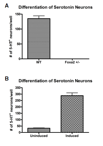 Figure 3 Foxa2 regulates serotonin neuron number. (A) Foxa2 is necessary for the differentiation of serotonin neurons. Abundant serotonin neurons differentiate from control E9.5 hindbrain explants, whereas almost no serotonin neurons are born from foxa2 nullizygous explants. (B) Foxa2 is sufficient to drive the differentiation of serotonin neurons. F4 mouse embryonic stem cells, which express foxa2 inducibly under the control of doxycycline, were differentiated to neurons. Doxycycline induction of foxa2 leads to a greater than eightfold increase in the number of serotonin neurons generated, as compared to uninduced cells.