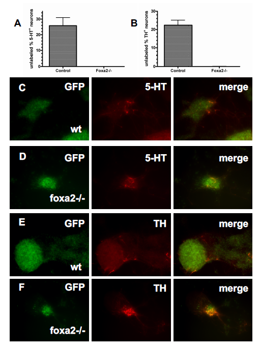 Many secreted factors, including shh, netrin-1, TGF-beta, wnt-1, and others, are expressed in the floor plate. This raises the possibility that the effects of foxa2 on the differentiation of dopamine and serotonin neurons are neither direct nor cell-autonomous. The classical embryological method to study cell-autonomy is by mixing genetically distinct cells in vitro or analyzing genetically mosaic organisms. To address this issue, we co-cultured dissociated midbrain and hindbrain progenitors from H2-GFP transgenic and foxa2-/- embryos of the same age. In these experiments, all of the differentiated serotonergic and dopaminergic neurons express GFP (Figure 4). The foxa2 (and GFP)-expressing progenitors, in these experiments, are unable to rescue monoaminergic differentiation, indicating that foxa2 is autonomously required to differentiate into a serotonin or a dopamine neuron.