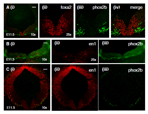 For immunohistochemistry of mouse embryo sections and fixed cells in vitro, the following antibodies were used: En1/2, Foxa2 and Nkx2.2 (1:10, mouse monoclonal, Developmental Studies Hybridoma Bank, University of Iowa); Foxa2 (1:4,000, rabbit polyclonal, gift of Ariel Ruiz I Altaba); Foxa2 (1:50, goat polyclonal, Santa Cruz Biotechnology); Lmx1b (1:4,000, guinea pig polyclonal, gift of T. Jessell); Lmx1b (1:500, rabbit polyclonal, gift of T. Muller); nestin (1:50, rabbit polyclonal, McKay lab); Nkx2.2 (1:400, guinea pig polyclonal, gift of B. Sosa Pineda); Phox2a (1:800, rabbit polyclonal, gift of J.-F. Brunet); serotonin (1:4,000, rabbit polyclonal, Sigma); β-tubulin (1:800, mouse monoclonal, Covance); tyrosine hydroxylase (1:400, rabbit and sheep polyclonals, Pel-freez).