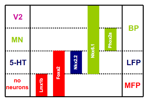 Mapping of progenitor domains in the spinal cord and midbrain has proven to be useful in elucidating mechanisms of fate determination and differentiation in these regions of the CNS.20–22 Initial maps of the embryonic ventral hindbrain have been generated, but these maps do not include markers of the floor plate, which has been considered non-neurogenic.23,24