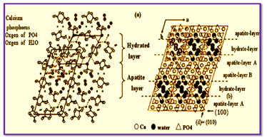 Calcium is major structural element in vertebrate skeleton (bones and teeth) in the form of calcium phosphate (Ca10(PO4)6(OH)2 known as hydroxyapatite (Figure 2). It is key component in the maintenance of the cell structure. It also has important role in bone remodeling and tooth re-mineralization is well known. However, calcium also plays a very imperative role in many biochemical reactions, which are essential for normal functioning of cells. Membrane rigidity, permeability and viscosity are partly dependent on local calcium concentration. The most abundantly produced phosphate mineral is carbonated hydroxyapatite, also called dahllite.5 It is mainly found in vertebrate bones and teeth, as well as in the shells of inarticulate brachiopods. Biogenic carbonate apatite crystals are usually plate-shaped and are exceedingly small i.e. 2-4nm thick and some tens of nanometers long and wide11 (Table 1). Over 99 percent of total body calcium is found as calcium hydroxyapatite ((Ca10(PO4)6(OH)2 in bone and teeth, where it provides hard tissue with its strength. At any time most of the calcium in the body exists as the mineral hydroxyapatite. In plasma 45% of calcium is found in ionized form or physiologically active form, 45% bound to proteins that occur predominantly in albumin. 10% is complexed with anions such as citrate, sulfate and phosphate. It is the most suitable ceramic material for hard tissue replacement implant from the point of view of biocompatibility. It has the chemical similarity with the mineral portions of hard tissue (e.g. calcium+phosphorous).