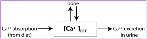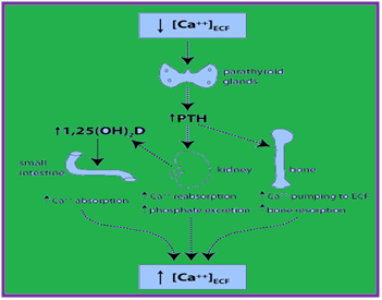 Figure 8 Showing endocrine regulation of [Ca++] ECF (a) PTH stimulates the release of Ca++ from bone, in part by stimulating bone resorption (b) PTH decreases urinary loss of Ca++ by stimulating Ca++ reabsorption (c) PTH indirectly stimulates Ca++ absorption in the small intestine by stimulating synthesis of 1,25(OH)2D in the kidney.