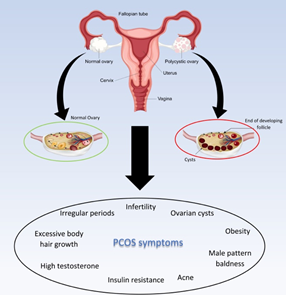 Polycystic Ovarian Syndrome is a multisystemic disorder affecting the ovaries as well metabolic and endocrine functions. The ovary is multifunctional, possessing secretory and gametogenic functions. Due to this, dysfunction of the ovary can lead to a variety of health issues. The development of PCOS may be attributed to several factors such as genetics, epigenetics, hyperandrogenism, insulin resistance, and environmental factors. Possessing the Anti-Mullerian hormone coding gene can confer a predisposition for PCOS. Pathologically, a high LH:FSH ratio and an excess of GnRH are widely recognized as features of PCOS. Low-grade chronic inflammation is also commonly present in women with PCOS. Additional symptoms include chronic anovulation, increased ovarian function, excess androgen levels, menstrual abnormalities, and ovarian cysts. PCOS is linked to multiple other conditions such as hyperinsulinemia, insulin resistance, obesity, hyperandrogenism, type 2 diabetes, hypertension, cardiovascular disease, and infertility (Figure 1).1,2