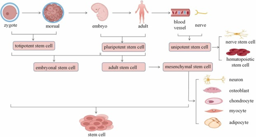 Figure 2 The potency of stem cells throughout development is shown here. In addition, numerous sources of stem cells are shown. The ability of mesenchymal stem cells to differentiate into multiple tissue types is also depicted.4