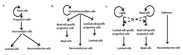 Based on various experimental evidences, different models have been devised to explain the routes of differentiation of multipotent prostate stem cells into other epithelial cell types: