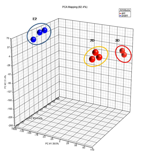 A 3D PCA-covariance plot with an overall principle component (PC) of 82.4%. Three distinctive groups were observed, E2 being clustered furthest away from DIFF groups (2D and 3D). Clustering is represented by colored spheres with the groups’ names.