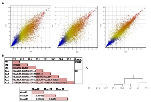 Figure 2 Global gene expression profiling. (A) Scatterplot representation of the mean signal intensity values of the 33,297 transcripts across different comparisons. (B) Correlation coefficients (r) were calculated using the mean signal intensity values for each cell line (including comparison of each of the biological replicates). An r-value 1 indicates perfect correlation and is represented by the darkest shading. Less correlated pairs are represented by lighter shades. (C) Global dendogram based on the overall gene expression profiles of the samples. Two distinct clusters corresponding to UNDIFF and DIFF, followed by further separation between 2D and 3D.