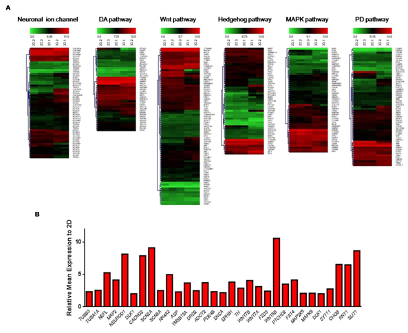 Specific gene lists that are involved in the DA neural differentiation of hESCs were analysed which includes: neuronal ion channels, DA synthesis, Wnt, Sonic hedgehog (SHH), MAPK signaling and PD pathways. The gene lists (~55 genes from each pathway, minus the housekeeping genes) were obtained from Super Arrays Biosciences website: http://www.sabiosciences.com.