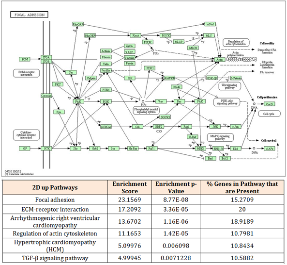 Figure 5 Significant pathways in 2D. The 659 up-regulated mRNA set in 2D are significantly enriched by mRNA coding for proteins involved in focal adhesion pathway. Both pathway pictures were imported from KEGG pathway website. The biological relationships between two proteins are represented as a line (an edge).