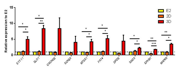 To validate the results from the microarray assays, qPCR was performed with the samples used for the microarray analysis with an additional sample of E2 cell line, passage 36 which has been differentiated under 3D platform with PA6 cells for 28 days (resulting total of 3 biological replicates for each group; E2, 2D and 3D). Out of the genes which were previously investigated, a total of 10 genes (2 genes from each gene set tested) were selected which showed up-regulation in 3D samples; SYT1, SLIT1, CACNG2, SCN2A, MTSS1, FAT4, DRD2, SNCA, EPHB1, MAPK8. Using the ΔΔCt method to determine fold differences of relative gene expression in 2D vs 3D, the qPCR experiments largely confirmed the results from the microarrays (Figure 6). Although we observed variability between the samples, there was an overall consistency between both methodologies demonstrating a broad up-regulation of the selected genes. However, CACNG2, SCN2A and DRD2 did not reach significance in the qPCR results using Student’s t-test, unpaired, two-tailed statistics method.