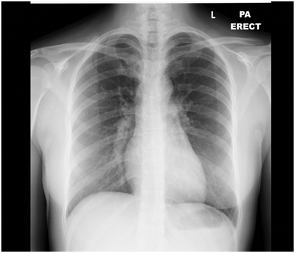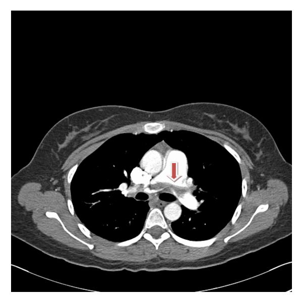 A 23 year old woman previously well presented with a sudden onset severe chest pain and shortness of breath. She was on oral contraceptive pills and has a family history of Protein C deficiency. Her father had recurrent pulmonary embolism from the age of 32 and her grandmother had a history of recurrent strokes from the age of 30. On examination, she was tachycardic, tachypneic and hypoxic. Her CXR was normal (Figure 1). However her CT pulmonary angiograghy showed a saddle pulmonary embolus (Figure 2). She was anticoagulated and booked for an echocardiogram.