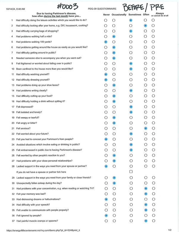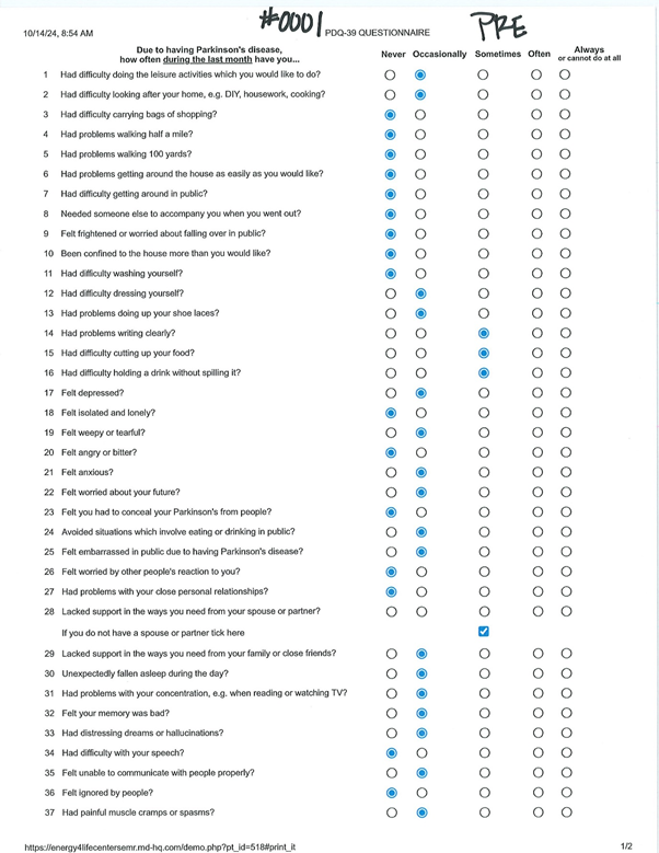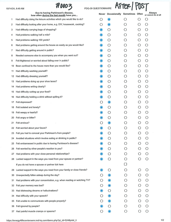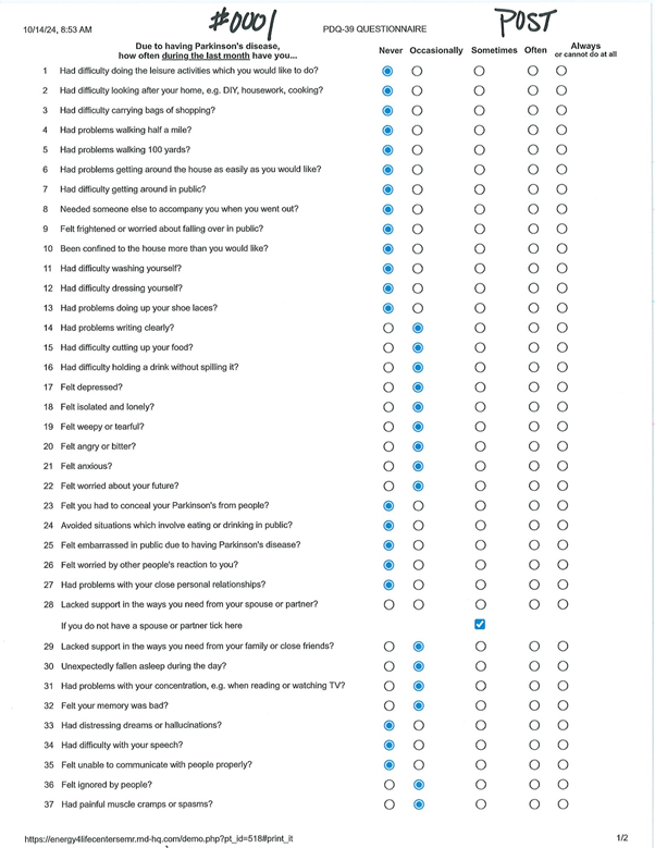 This patient completed both a pre- and post-treatment PDQ39. The pre-treatment PDQ39 resulted in a score of 42.2 (see Table 3). The post-treatment PDQ39 resulted in a score of 26.8 (see Table 4). The patient reported an increased feeling of well-being and a reduction in tremors.