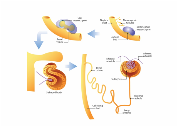 The organogenesis of kidneys starts as early as fourth week of gestation, cranio-caudally with the formation of pronephros from the mesoderm, a non-functional vestigial structure from which the mesonephros is formed. The mesonephros is made up of primitive nephrons that are connected to the pair of mesonephric (Wolffian) ducts. Metanephros is formed when the ureteric bud, a localized outgrowth of the nephric duct, invades the metanephric mesenchyme, and undergoes morphogenesis to create a complex ductal network. The ureteric bud further develops into ureter, pelvis, calyces and collecting ducts while the pool of stem cells of the metanephric mesenchyme differentiates to form other renal structures, from collecting tubules to glomerulus. The metanephros develops fully by the 10th week of gestation while the whole kidney continues to develop till 32nd to 36th week of gestation (Figure 1).5‒8