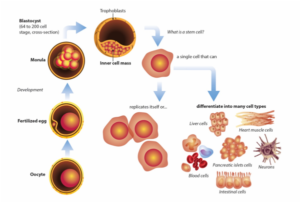 Embryonic stem cells (ESC) are the pluripotent stem cells derived from the inner cell mass of a blastocyst. These cells are capable to differentiate into any germ cell line: mesoderm, endoderm and ectoderm. Hence, in the past, these cells’ therapeutic potential was thought to be useful in regenerative therapy (Figure 2).