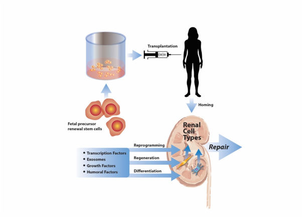 In employing fetal precursor stem cells in treating the CKD, it has been discovered that glomerular defects respond well to the core treatment component being kidney precursor cells. Precursor cells from other organs such as the adrenal cortex, mesenchyme, vascular endothelium and placenta should be used as it will facilitate a better therapeutic outcome. These cells provide a wide range of growth factors and cytokines stimulating the paracrine reactions in repairing the kidney, rendering a better clinical response.48,49