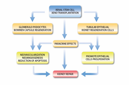 There are several adaptation mechanisms of the cells of the kidneys towards various insults. These include compensatory renal hypertrophy, cell proliferation, reprogramming of endogenous renal cells, renal progenitor cell differentiation, mesangial cell proliferation and migration, migration of bone-marrow cells into the kidney, and neoangiogenesis. Certain cells such as the mesenchymal cell possess the ability to differentiate into epithelial cells while some renal epithelial cells have the ability to differentiate to further proliferate, migrate and differentiate into the necessary type of cells. Bone-marrow-derived cells can migrate to the kidney, inhibit apoptosis and enhance renal cell proliferation. To a certain extent, renal progenitor cells have some potential to differentiate and promote kidney regeneration. However, by and large, by the 36th week of gestation, the universal renal progenitor stem cells pool is exhausted. This renders a dire situation of halted regeneration. This warrants an alternative pathway of replenishing the progenitors and enabling regeneration. Stem cell therapy is a promising avenue.13‒16