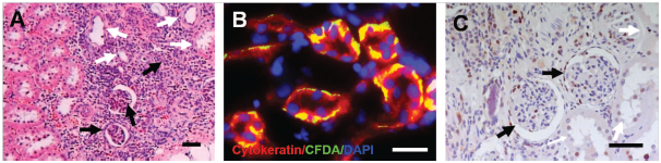Figure 5 Histological micrographs of transplants retrieved 6 weeks after transplantation. (A) Regenerated glomeruli (solid arrow) and tubules (open arrow) were observed in the fetal kidney precursor cell transplantation group. (B) Fluorescently labelled kidney precursor cells (green fluorescence) were detected in the reconstituted kidney tubules (red fluorescence). (C) Immunostaining for PCNA showed the presence of actively proliferating cells in the reconstituting glomeruli and tubules of the cell transplantation group.68